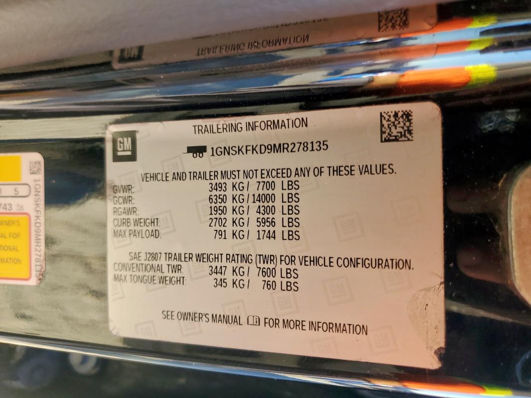 Run and Drive Lot number:90880065 VIN:1GNSKFKD9MR******
