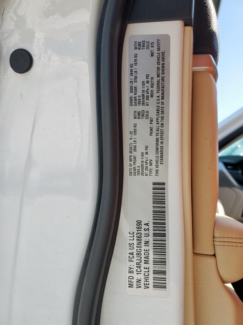 Run and Drive Lot number:92187005 VIN:1C4RJJBG8N8******